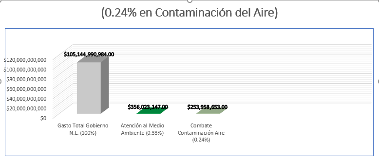 Porcentaje del Gasto Público destinado a resolver la Contaminación del Aire en Monterrey Nuevo León en el año 2020 (0.24% del total del Presupuesto para el año 2020). Fuente: Ley de Egresos del Estado de Nuevo León para el Ejercicio Fiscal 2020.
