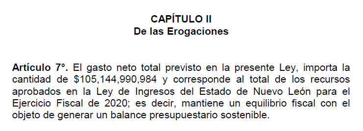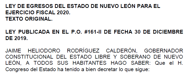La Ley de Egresos del Estado de Nuevo León es un documento público (disponible al alcance de todos) y se puede consultar en las siguientes páginas: (i) http://www.hcnl.gob.mx (pestañas «Trabajo Legislativo», «Leyes», (ii) http://www.nl.gob.mx pestañas «Acciones», «Legislación».